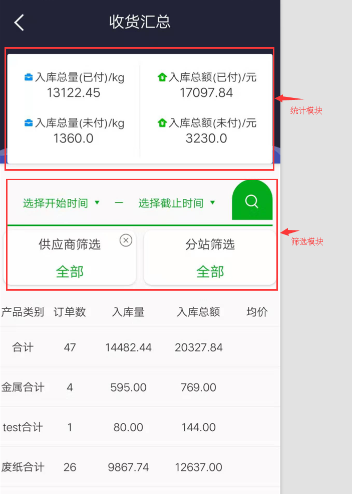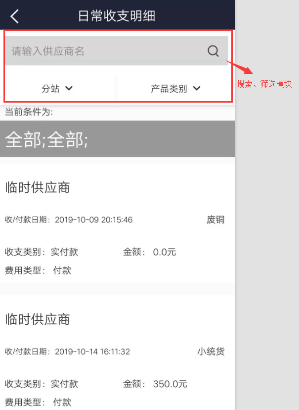 查看收入和支出明細數據,默認顯示全部,可通過“供應商名”搜索,按廢品類別進行條件篩選