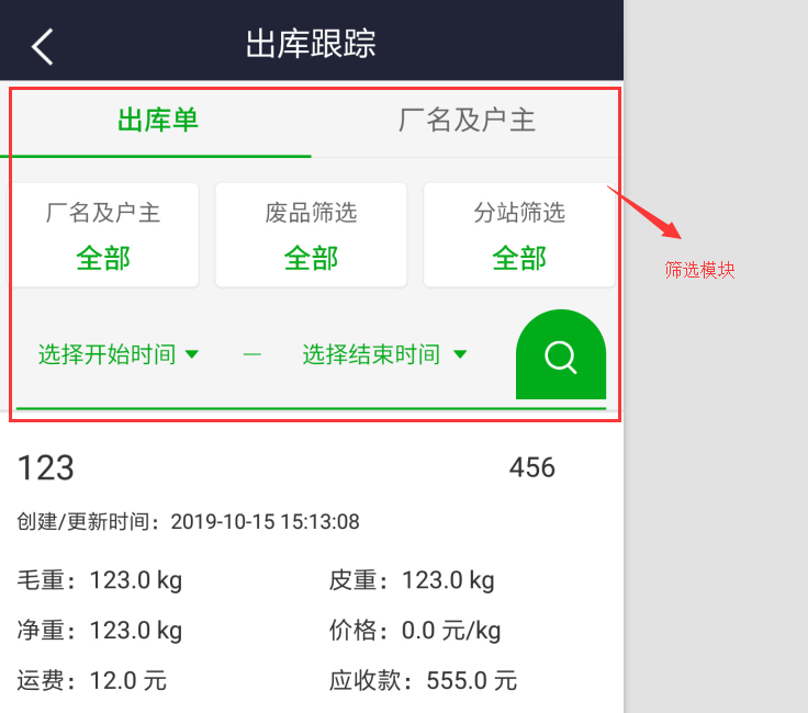 查看出庫數據,默認顯示全部,可按“廠名”、“廢品類型”、“分站”和“時間”進行條件篩選