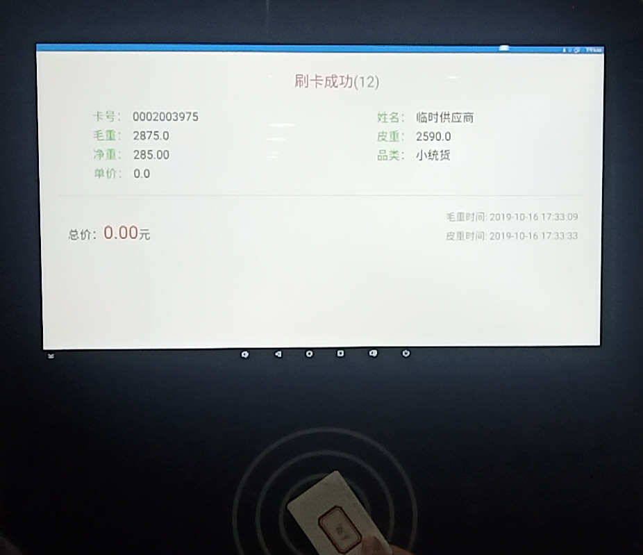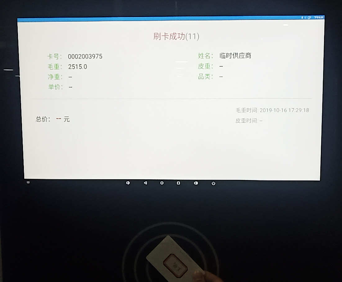 2)操作人將卡片放到 91 智能機刷卡區域,等待刷卡結果出現,第一次刷卡,出現毛重后,將車輛駛離地磅區域